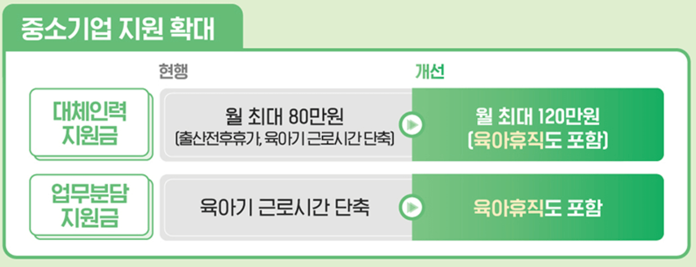▶ 사후 지급금 제도 폐지: 현재 육아휴직 급여의 25%는 복직 6개월 후에 지급되지만, 내년부터는 이러한 사후지급금 제도가 폐지되어 육아휴직 기간 중 전액을 받을 수 있게 됩니다.